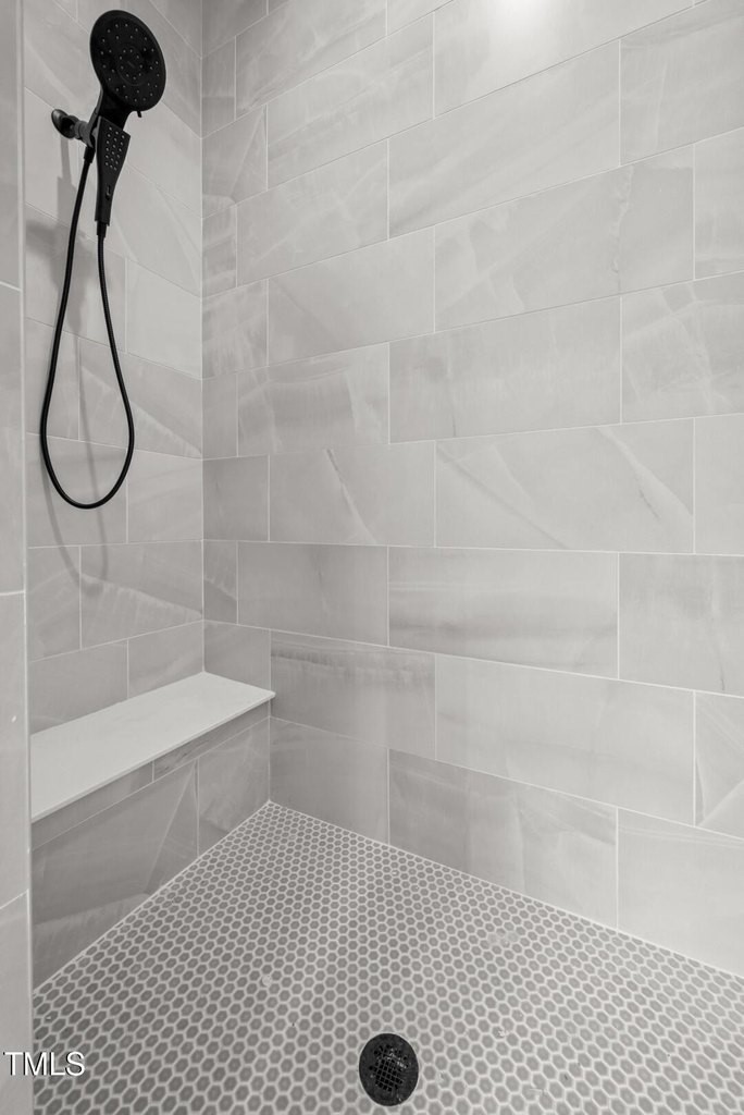 Presenting a modern two-story residence by Brandywine Homes, Inc. This home features a contemporary design with dark gray siding on the upper level and light-colored stacked stone veneer on the lower half. The grand two-story foyer is flanked by a private study with double glass doors and a fourth bedroom with a tiled walk-in shower and niche. The main floor offers a two-story family room with built-ins and a fireplace, with double sliders connecting to a screened porch leading to an outdoor patio. The gourmet kitchen features a dining area with premium appliances and a custom range hood. A hidden scullery includes a built-in oven, sink, and cabinetry. A powder room is also on this level. The main floor primary bedroom features site-finished hardwoods, a walk-in closet with built-ins, a tray ceiling with a wood inset, and crown molding. Its bathroom includes herringbone pattern tile floor, dual vanities, a freestanding tub, and a zero-entry shower with a bench and niches. The second floor has an accent wall overlooking the living room, Pocket office, two secondary bedrooms, two full baths, and a media room. Estimated finish, Early Fall 2025